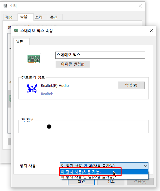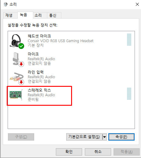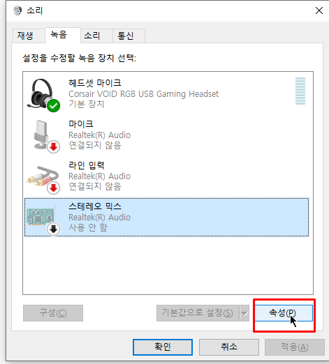 스테레오 믹스를 클릭하시고 속성을 클릭해줍니다.