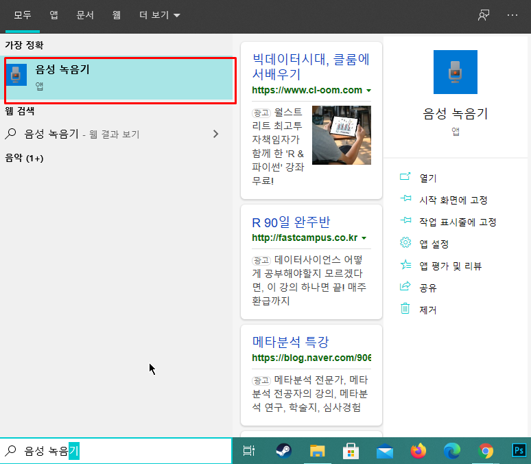 음성 녹음기를 검색해서 실행시킵니다.