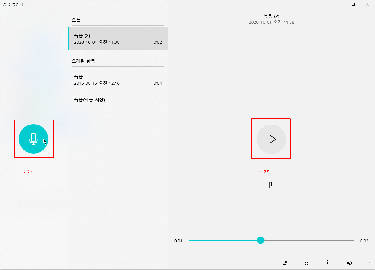 오른쪽에 재생 버튼을 누르면 자신이 녹음한 파일을 들을 수 있습니다.