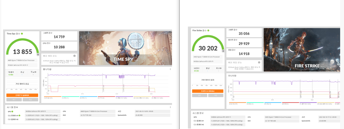 타임 스파이와 파이어스트라이크 벤치마크 점수에요!
